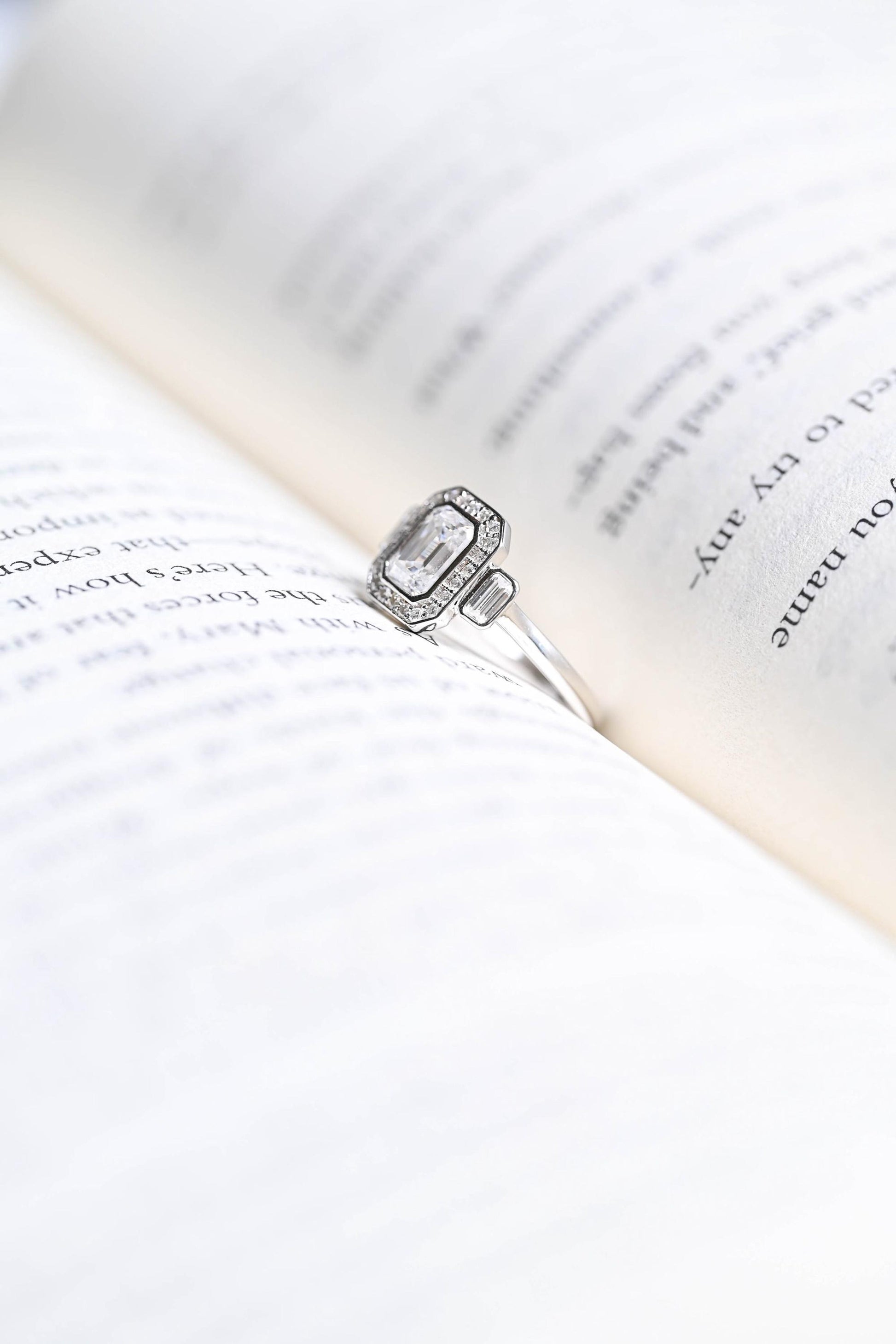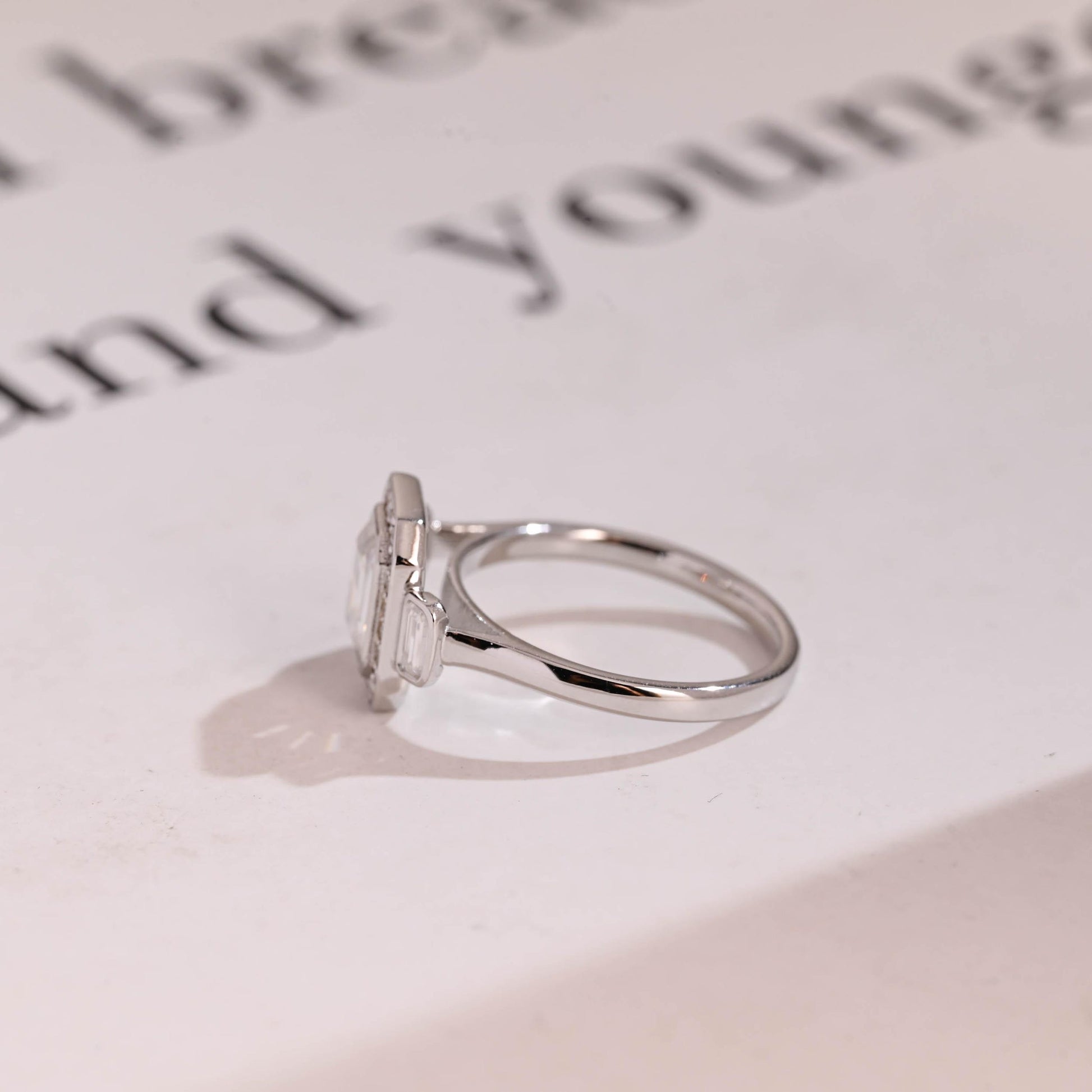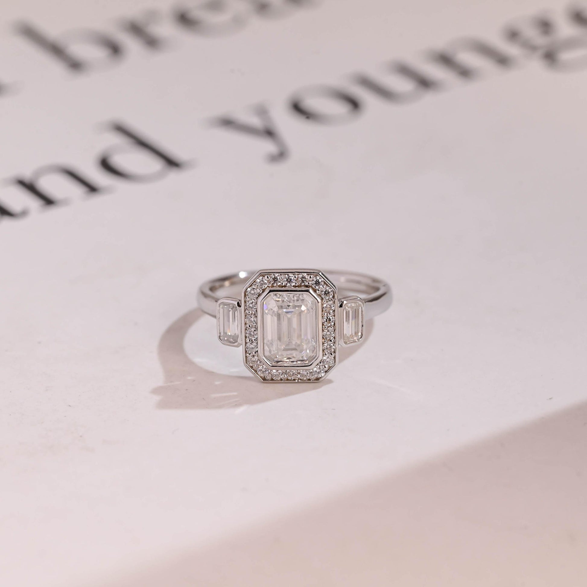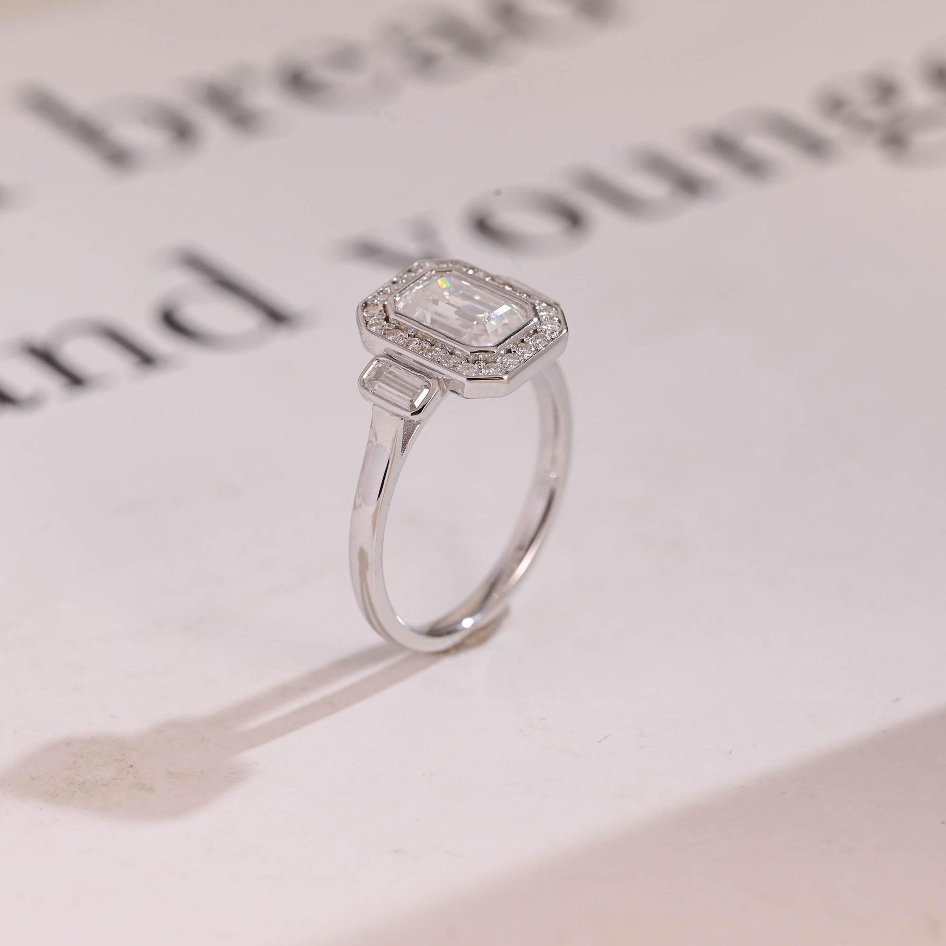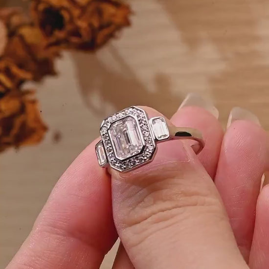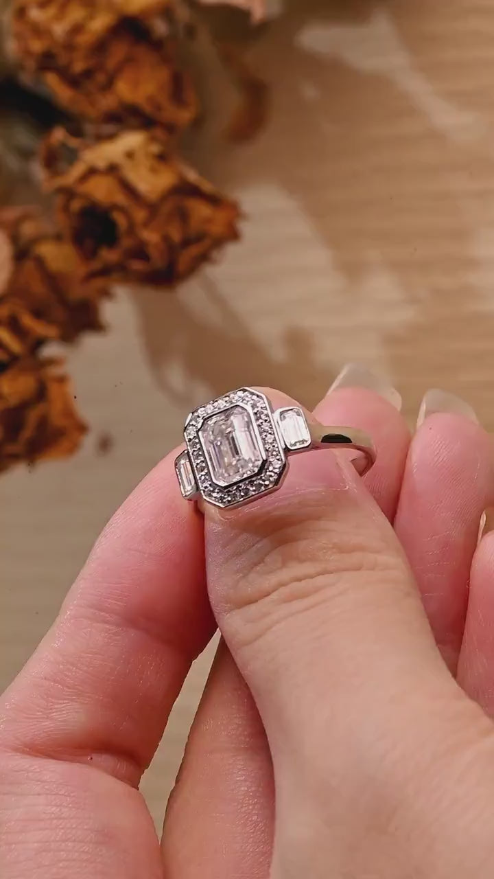 1.0 CT Emerald Cut Halo Three Stone Moissanite Engagement Ring